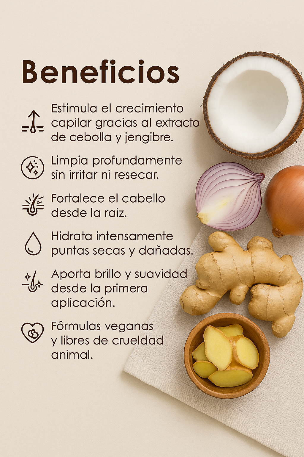 Este ritual combina el poder purificante del Shampoo de Cebolla y Jengibre con la nutrición profunda de la Mascarilla Pulpa de Coco, para un cuero cabelludo limpio y un cabello saludable de raíz a puntas.